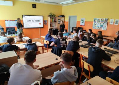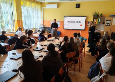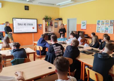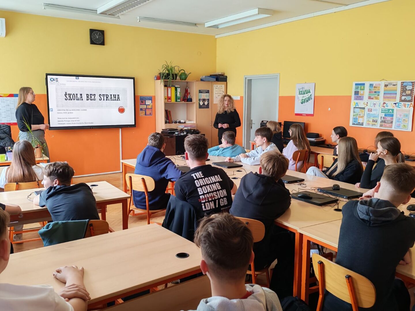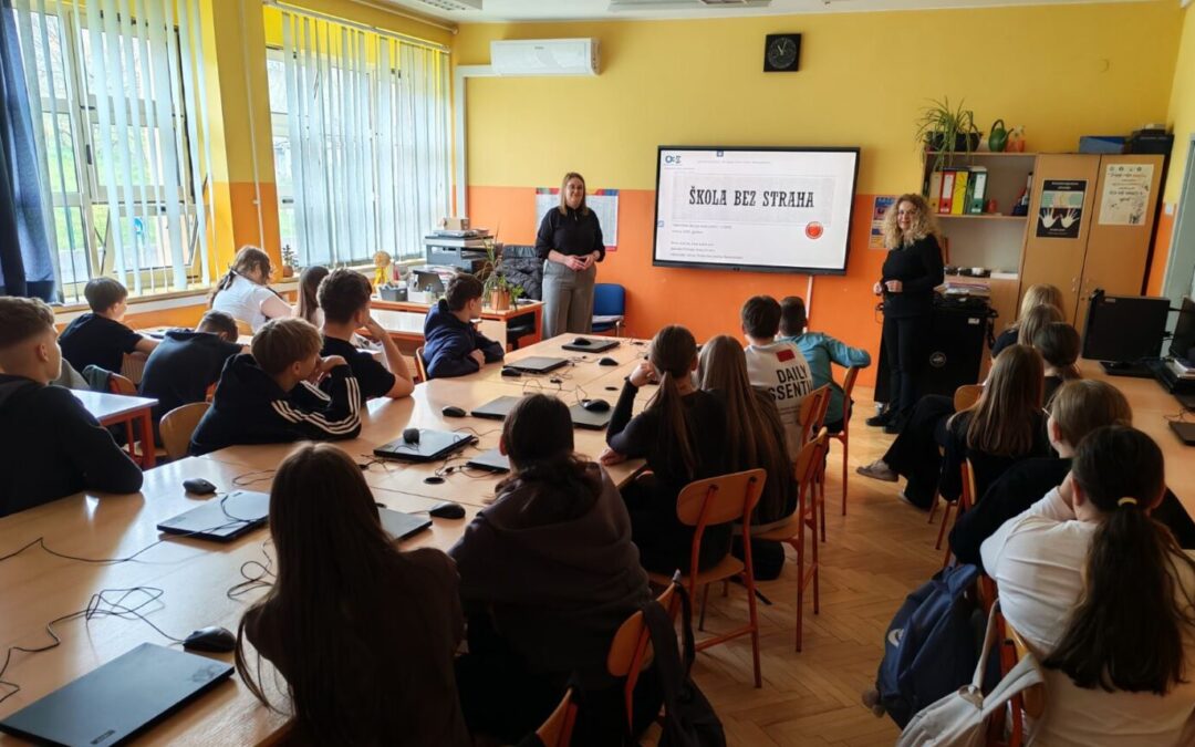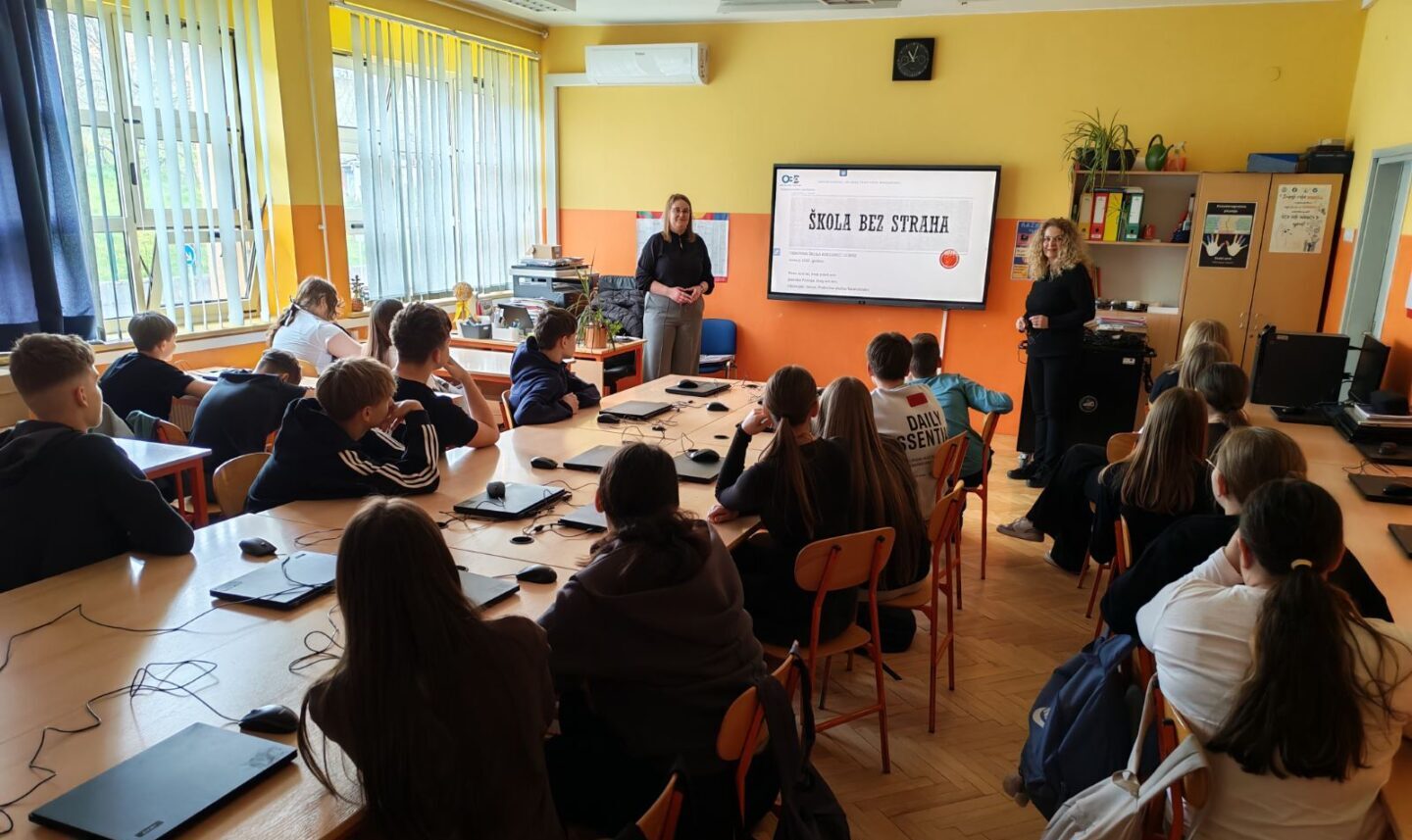 U okviru prve teme „Škola bez nasilja“, učenici su kroz interaktivno predavanje dobili osnovna znanja o razlikovanju sukoba i nasilja, razumjeli što je vršnjačko nasilje te gdje se ono najčešće pojavljuje. Također su se upoznali s različitim oblicima vršnjačkog nasilja te s ulogama koje se mogu pojaviti u situacijama nasilja (žrtva, žrtva-počinitelj, branitelj, aktivni i pasivni promatrač te neangažirani promatrač). Predavanje je obuhvatilo i razumijevanje razloga zbog kojih se pojedinci počinju nasilno ponašati, moguće posljedice takvog ponašanja te osjećaje koji prate iskustvo nasilja. Poseban naglasak bio je na razvijanju vještina prepoznavanja nasilja i pronalaženju konstruktivnih načina suočavanja s njim.